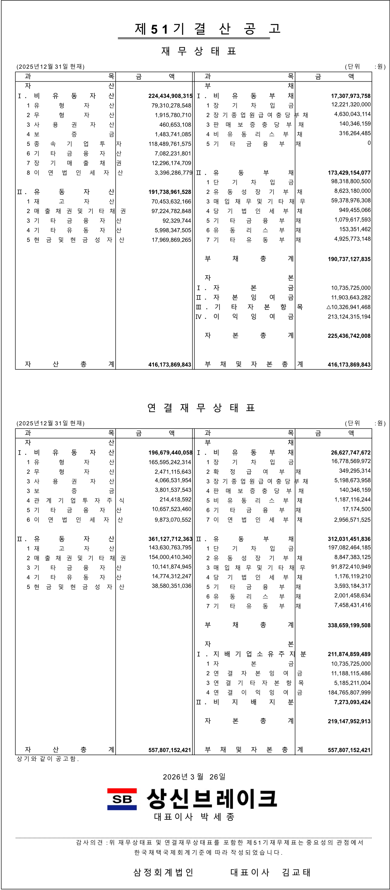 상신브레이크 제51기 결산공고